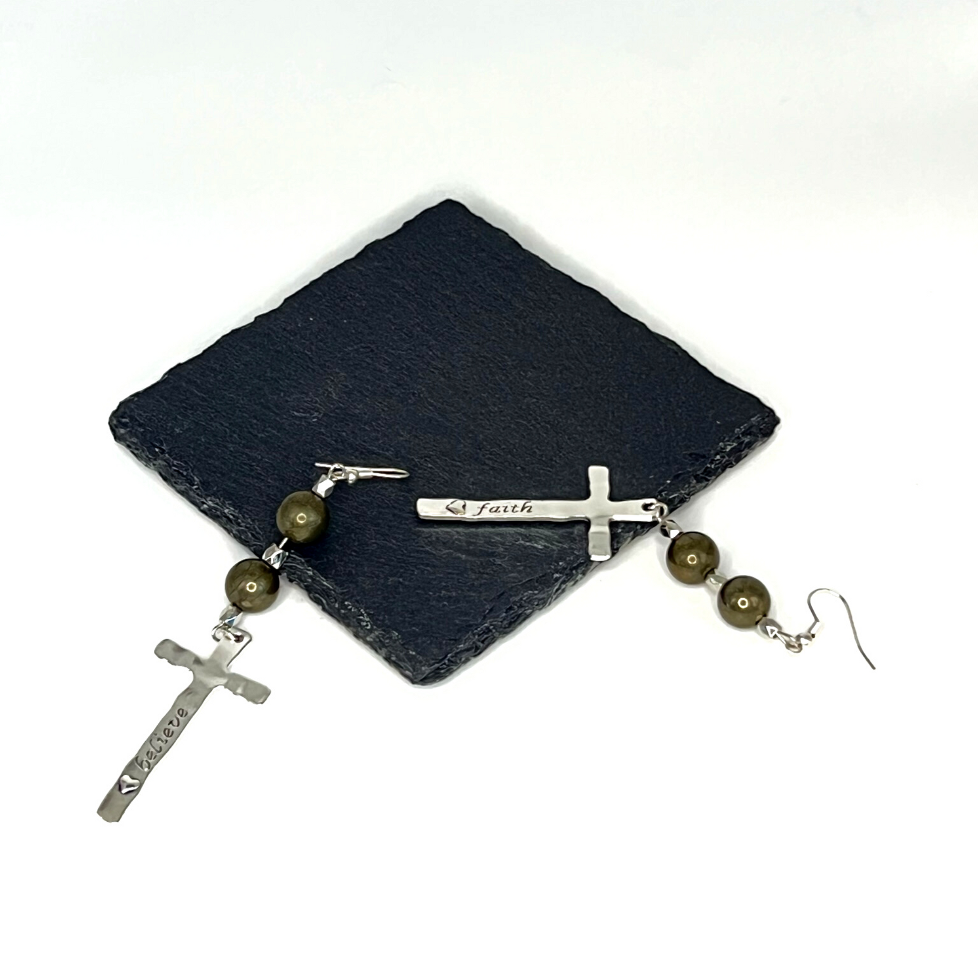 These long dangle earrings are crafted with pyrite beads and feature metal crosses engraved with the words "Faith" and "Believe".
