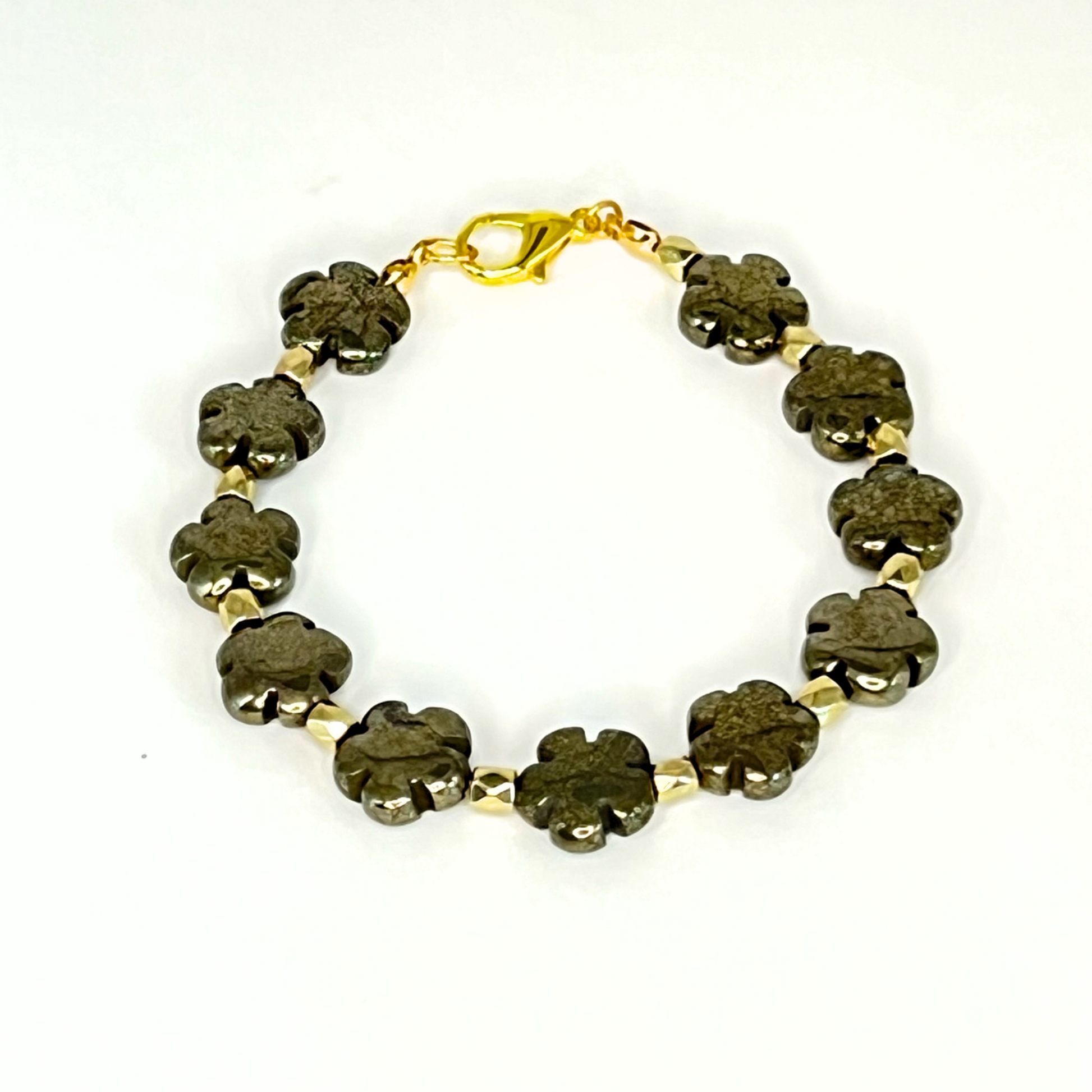 Statement beaded bracelet made of pyrite beads. The flower shaped natural grey pyrite is combined with small, faceted metal beads in a golden tone which gives the bracelet a shining look.