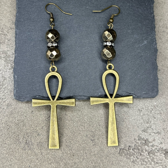 These handmade earrings are crafted from natural iron Pyrite, featuring round shaped, faceted beads plated in a golden hematite finish. The accompanying metal cross pendant is imbued with an old gold tone, lending a classic, vintage aesthetic to the design.
